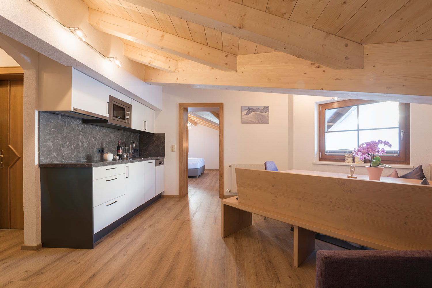 - Living room with sofa (extendable 140x200cm), dining table, kitchen with fridge, electric cooker with 4 hotplates, dishwasher, fume cupboard, Cafissimo coffee machine (coffee-taps available at reception), filter coffee machine, microwave, water heater, toaster, dishes, glasses, pans, pots and cooking utensils.